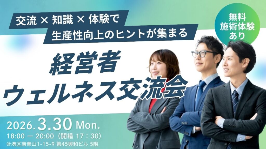 ウェルビルでは、オフィスワーカーの心身の不調・疲労に対して職場で受けられる出張ケアを提供しています。 このたび、下記日程にてウェルビル主催のオフラインイベントを開催します。 実施概要 日時:2026年3月30日(月)18:00 〜 20:00(開場17:30〜) ... -